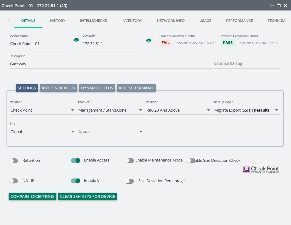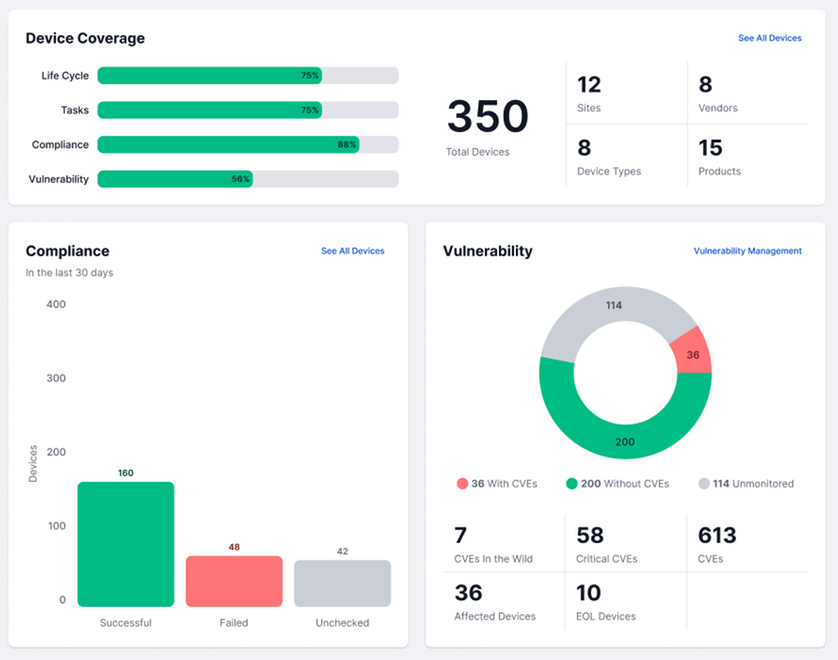 Quickly and easily run compliance checks on all devices to assess resilience and identify configuration drift. Automatically correct non-compliant configurations to align with industry-standard compliance frameworks and internal golden configurations.